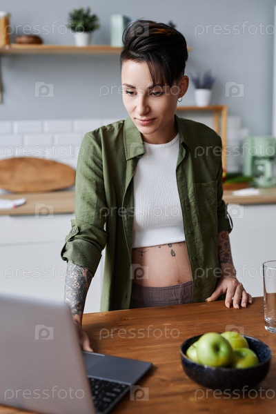 Беременная молодая женщина с татуировкой, использующей ноутбук на кухонном столе