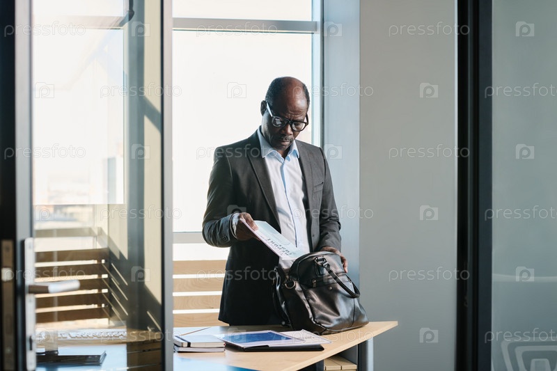 Серьезный зрелый директор бизнес-компании кладет документы в сумку