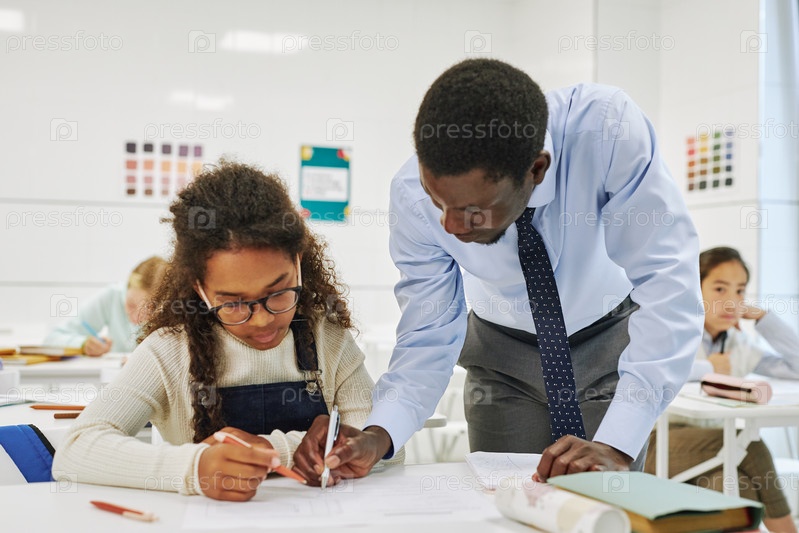 Консультирующая учительница в классе девочка