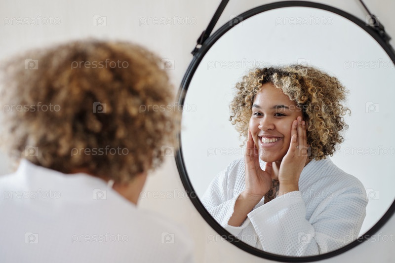 Молодая улыбающаяся чернокожая женщина касается своего лица, глядя в зеркало