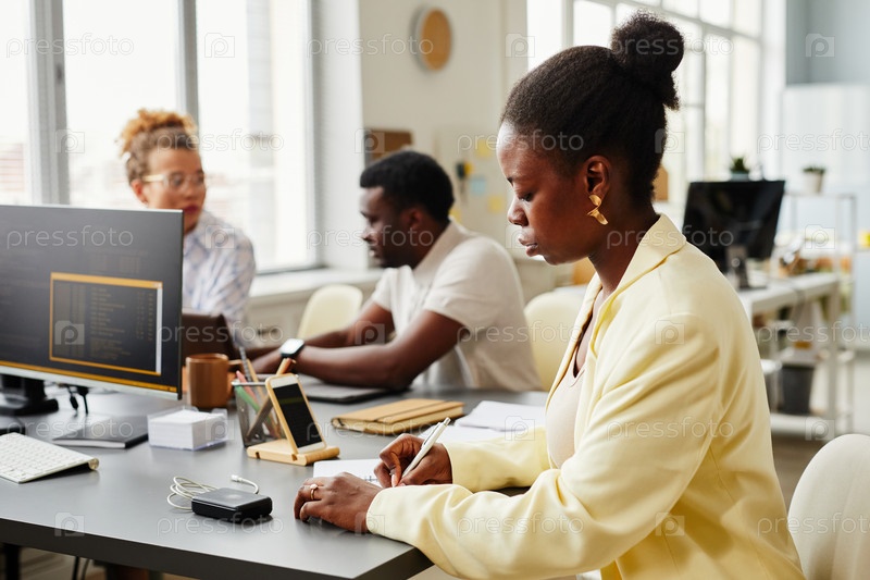 Женщина делает заметки в планировщике, сидящая в офисе