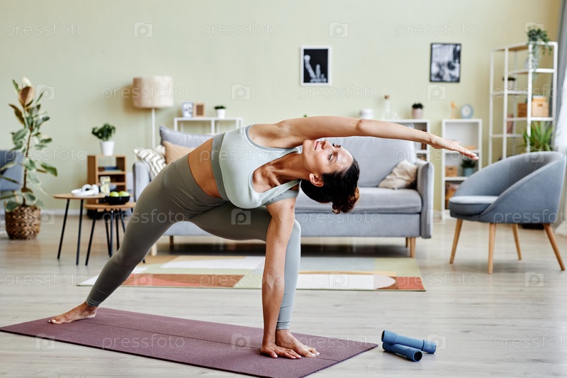 Женщина растягивается дома, наслаждаясь занятиями йогой с закрытыми глазами