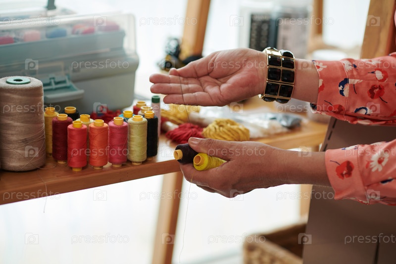 Швея, выбирающая нитки