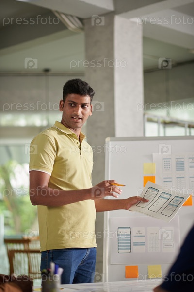 UX-дизайнер выступает на совещании