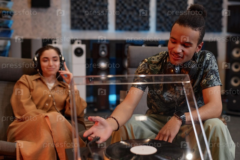 Молодая пара, слушающая дома дисковый проигрыватель