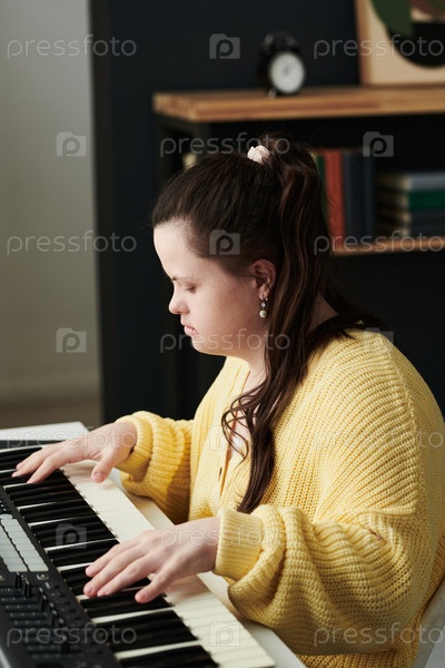 Женщина с инвалидностью играет на синтезаторе
