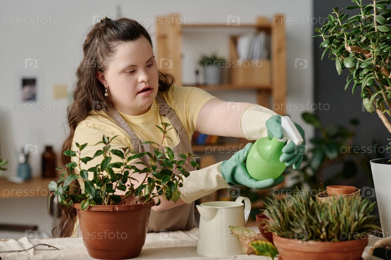 Девушка поливает зеленые растения с помощью распылителя
