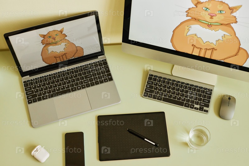 Выше вид ноутбука и настольного компьютера с красным котом на экранах