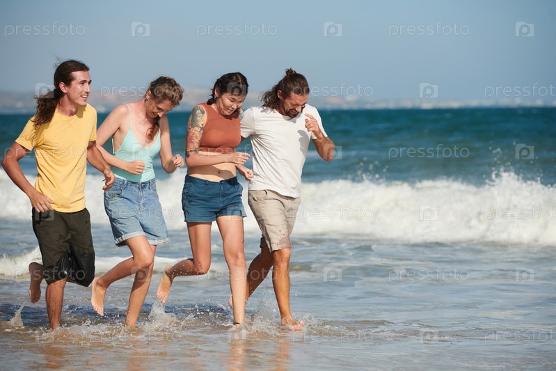 Молодые мужчины и женщины бегут на пляже