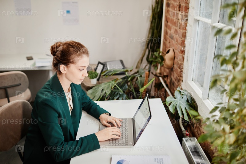 Молодая серьезная экономистка, анализирующая финансовые схемы