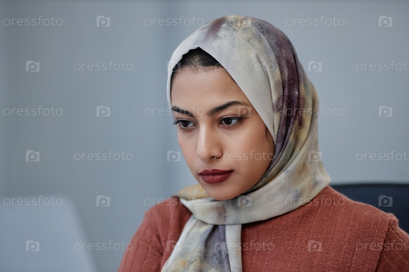 Молодая красивая мусульманка-сотрудник в плато смотрит на экран ноутбука