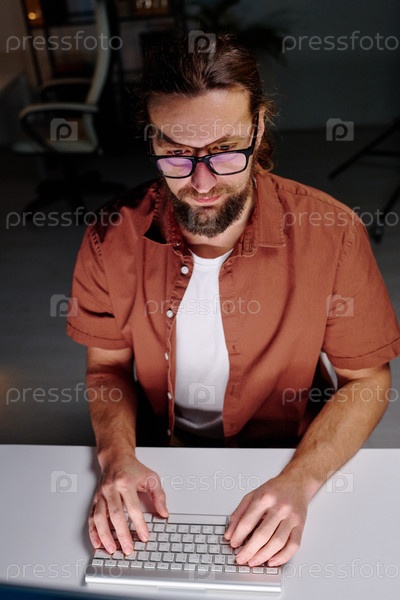 Молодой мужской программист в очках смотрит на компьютерный экран
