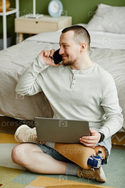 Улыбающийся мужчина с протезированной ногой использует ноутбук