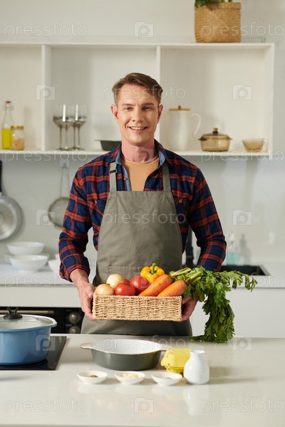 Веселый мужчина с корзиной овощей