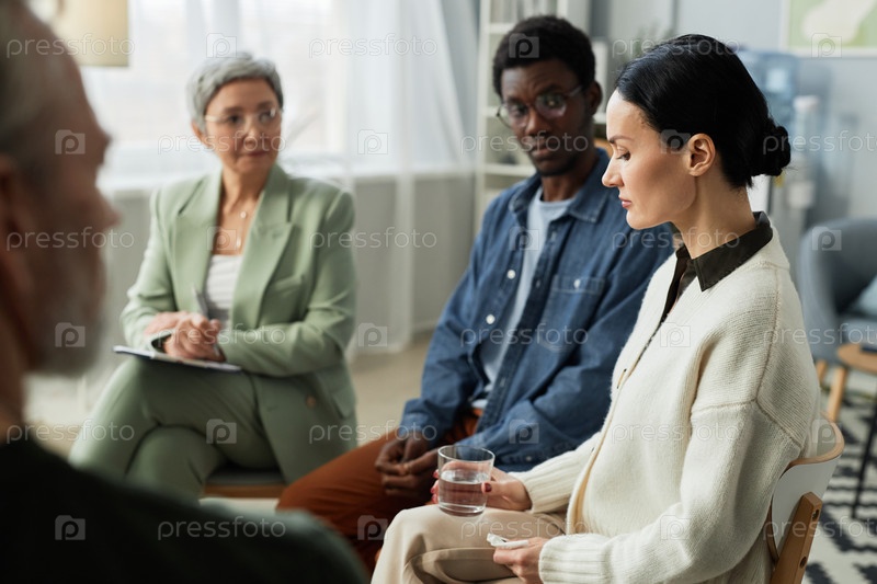 Боковой взгляд на стрессованную брюнетку, которая делится своими проблемами с группой поддержки