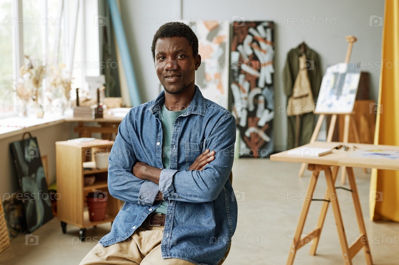 Молодой уверенный ремесленник в повседневной одежде, сидящий в студии