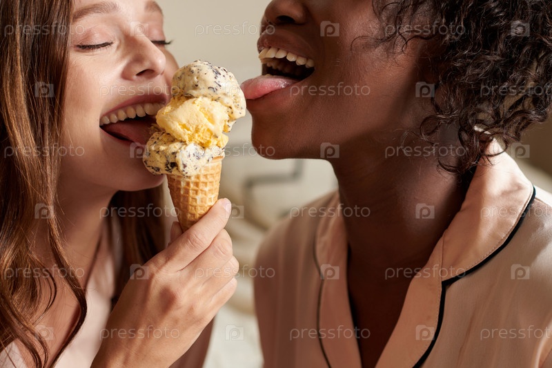 Женские друзья лизают мороженое
