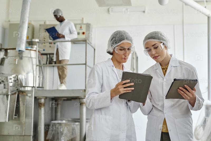 Две молодые женщины, одетые в лабораторные пальто на фармацевтической фабрике