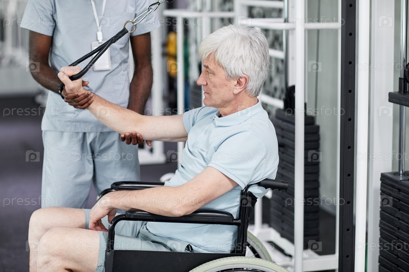Пожилой человек, пользующийся инвалидной коляской в клинике реабилитации