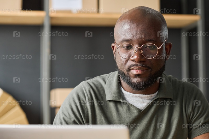 Мужчина, работающий на ноутбуке в складе