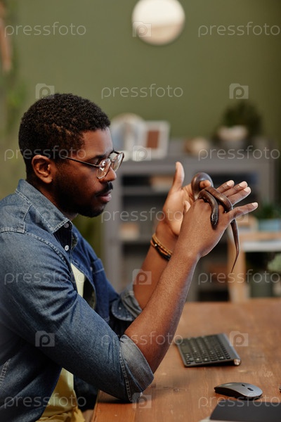Боковой вид молодого бизнесмена с медной крысой-змеей, сидящей у стола