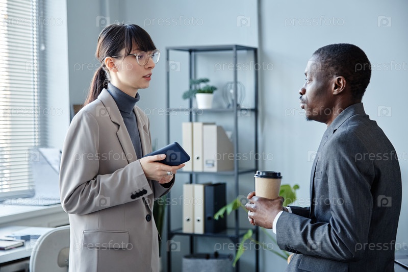 Молодая бизнесвумен разговаривает с коллегой в офисе