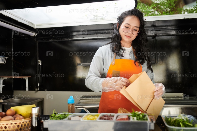 Молодая официантка в униформе держит бумажный пакет для аппетитной фаст-фуда