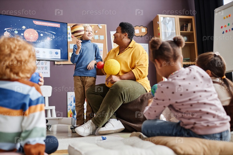 Милый мальчик с моделью Юпитера, стоящий рядом с учителем на уроке