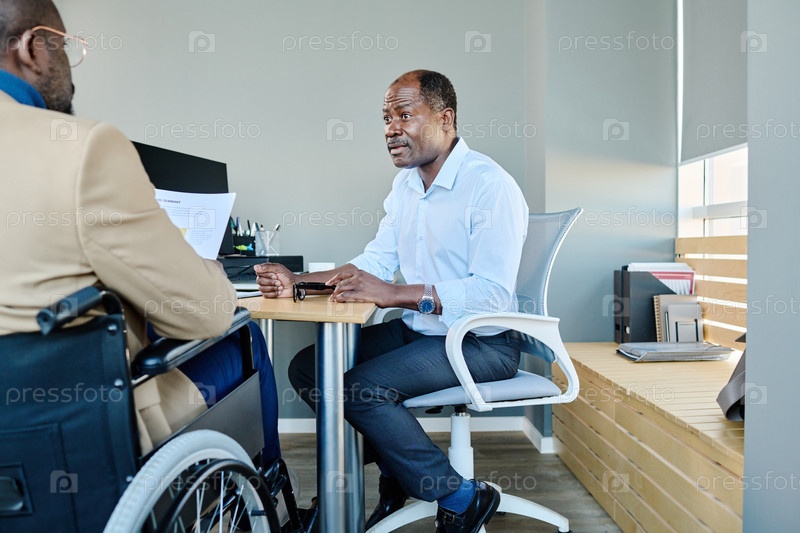 Зрелый директор сидит перед подчиненным с инвалидностью