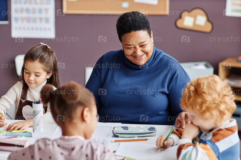 Сосредоточьтесь на счастливой зрелой учительнице и маленьком ученике с длинными темными волосами