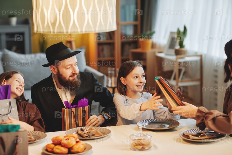 Еврейская семья делится подарками за обеденным столом