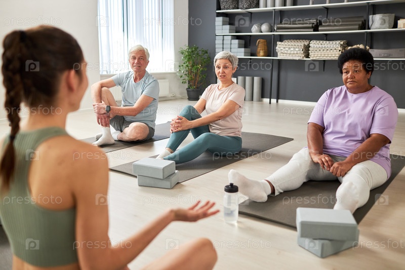 Люди, разговаривающие с инструктором по йоге в классе