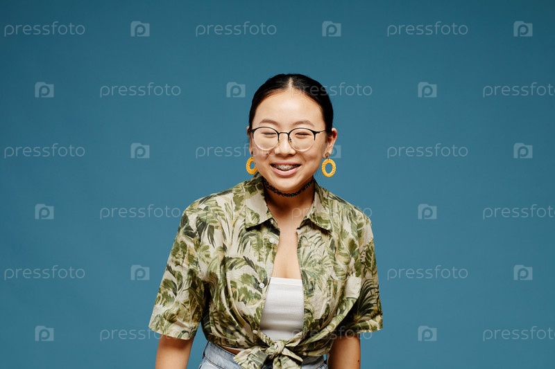 Азиатская девочка-подросток, носящая очки над синим