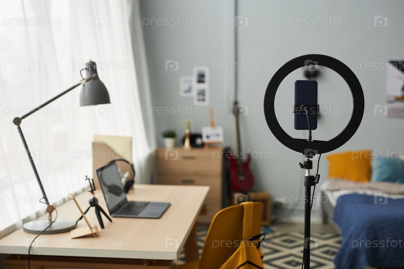 Круглый каркас со смартфоном в держателе, стоящем напротив рабочего места дизайнера