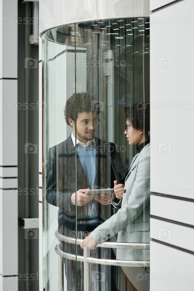 Деловая пара использует планшетный компьютер в лифте