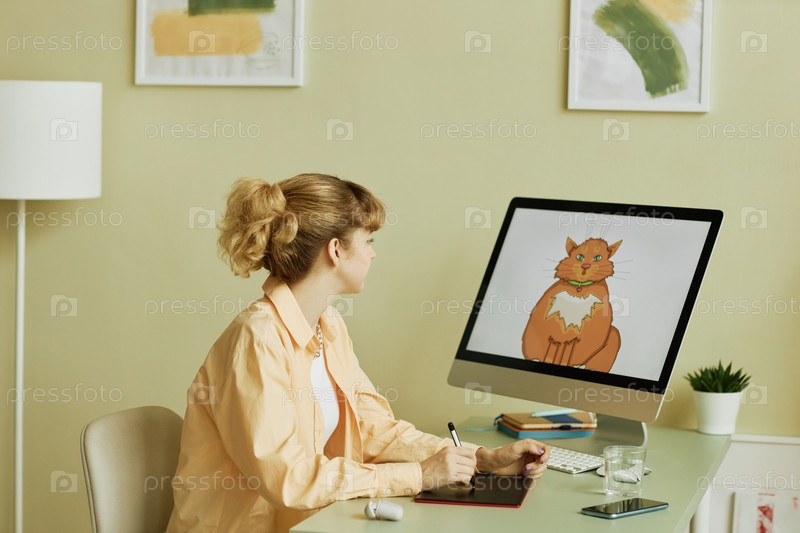 Молодая блондинка-дизайнер или графический художник рисует пушистую имбирную кошку