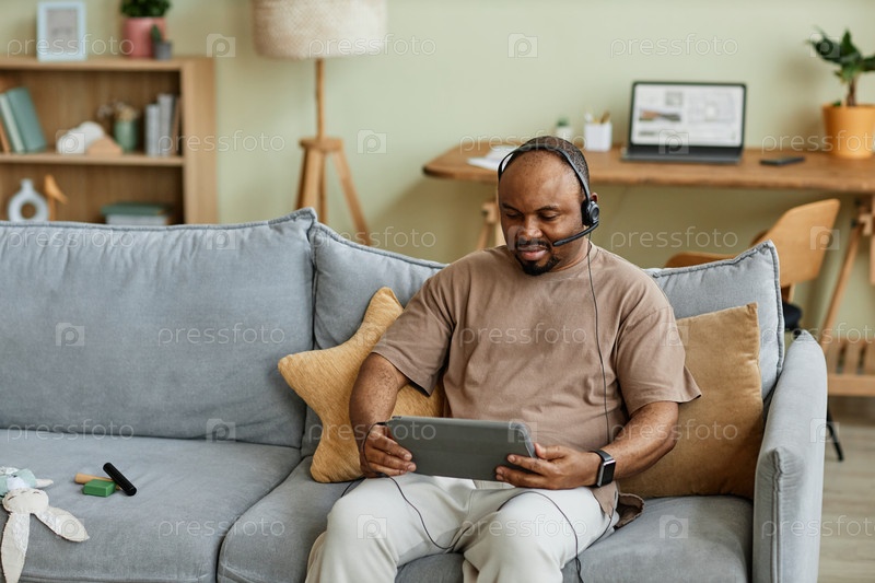 Мужчина, носящий гарнитуру с помощью видеочата