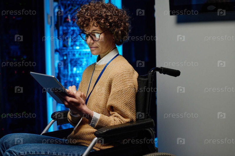 Женщина-сетевой инженер в инвалидном кресле, использующая планшетный компьютер