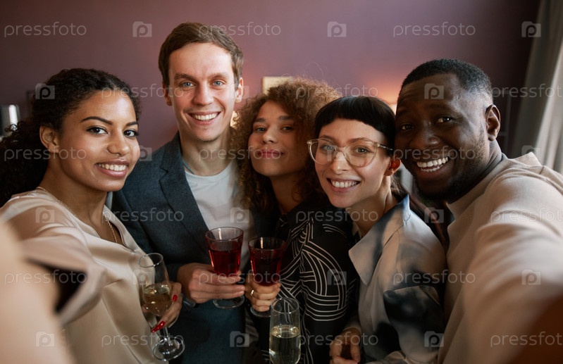 Счастливые молодые мультикультурные друзья со стаканами вина и шампанского