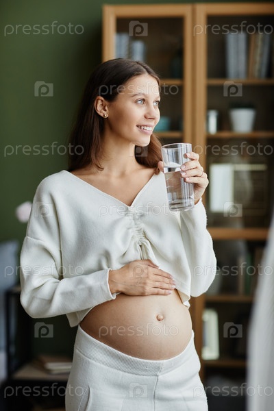 Беременная женщина пьет воду дома