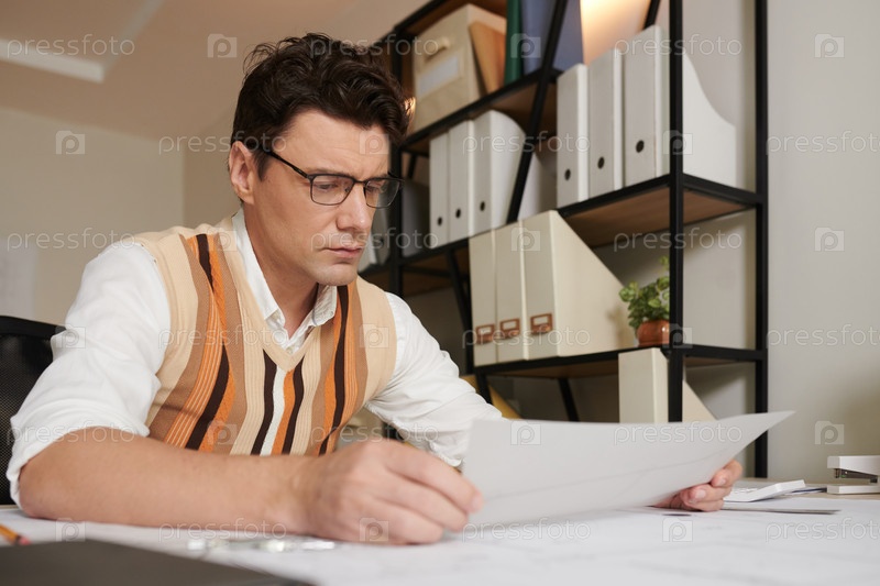 Серьезный инженер читает техническую документацию