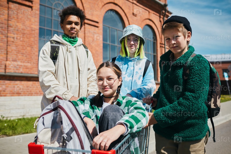 Подростки играют с тележкой на открытом воздухе