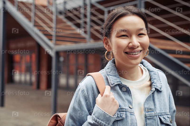 Молодая веселая женщина азиатской этнической принадлежности смотрит в камеру с зубчатой улыбкой
