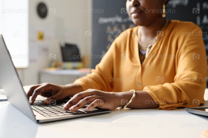 Учительница работает на ноутбуке в школе