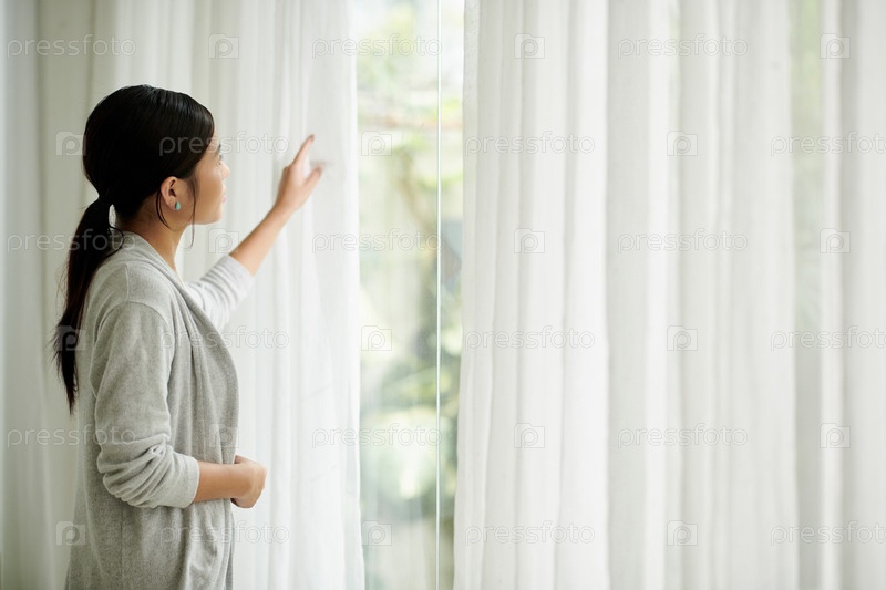 Молодая женщина открывает шторы