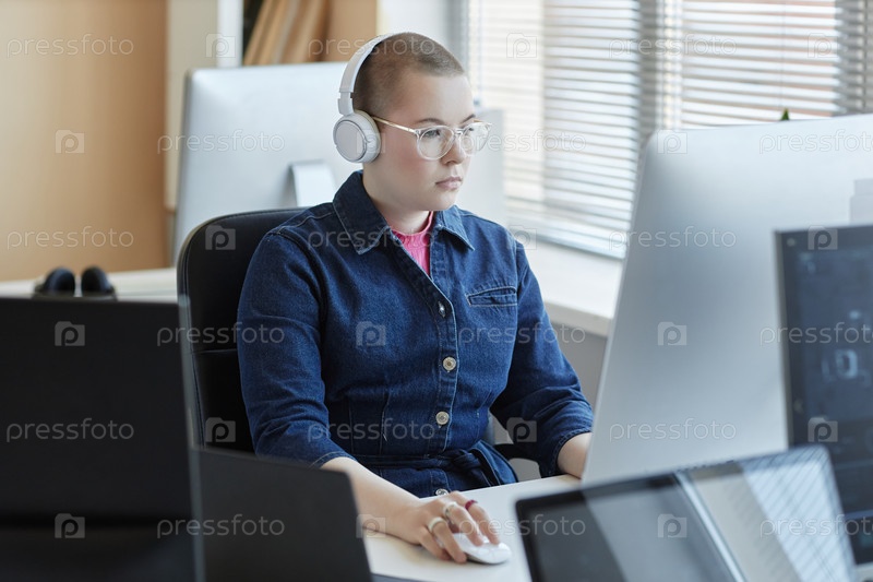 Молодая серьезная женщина-менеджер по кибербезопасности нажимает на компьютерную мышь
