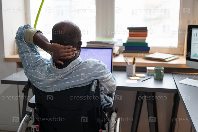 Мужчина сидит в инвалидном кресле и работает на ноутбуке