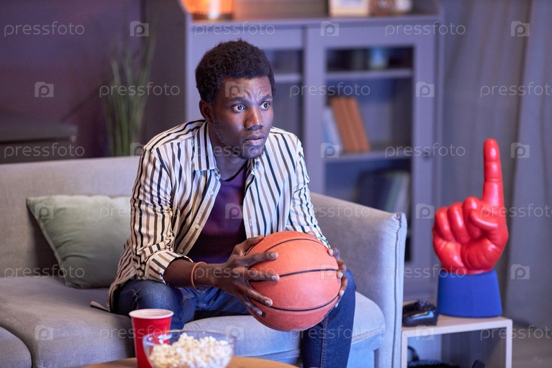 Молодой чернокожий мужчина смотрит баскетбольный матч по телевизору дома и держит мяч