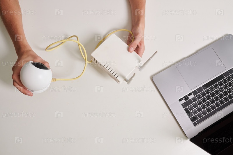 Мужчина устанавливает камеру видеонаблюдения дома