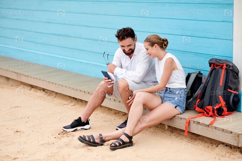 Пара туристов смотрят фотографии на телефоне
